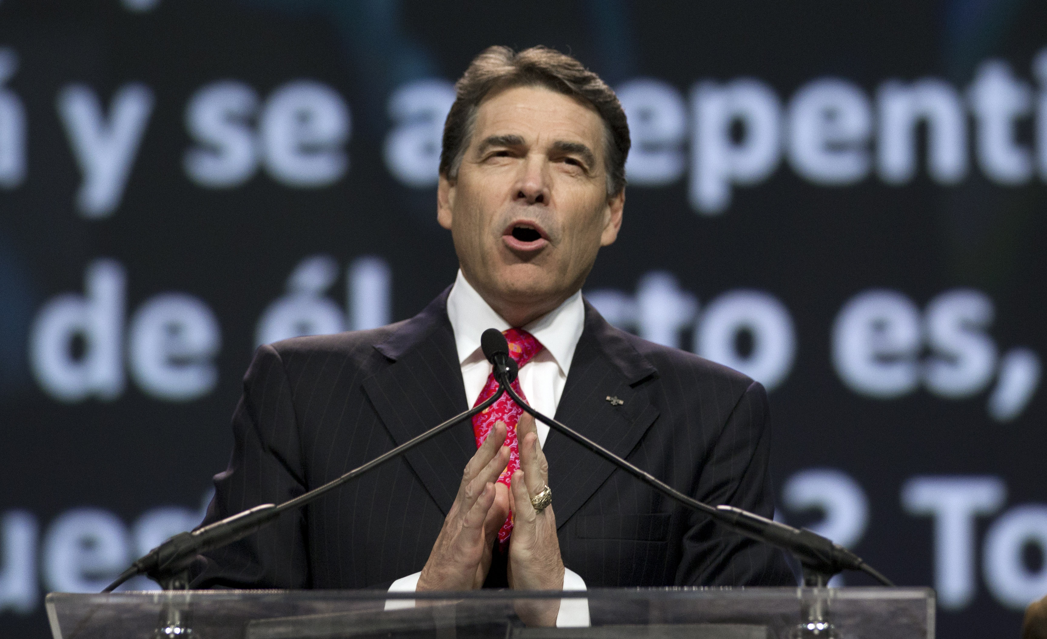 3454 x 2107~~$~~Texas Gov. Rick Perry prays at The Response, a call to prayer for a nation in crisis, Saturday, Aug. 6, 2011, in Houston. Perry attended the daylong prayer rally despite criticism that the event inappropriately mixes religion and politics. (AP Photo/David J. Phillip)